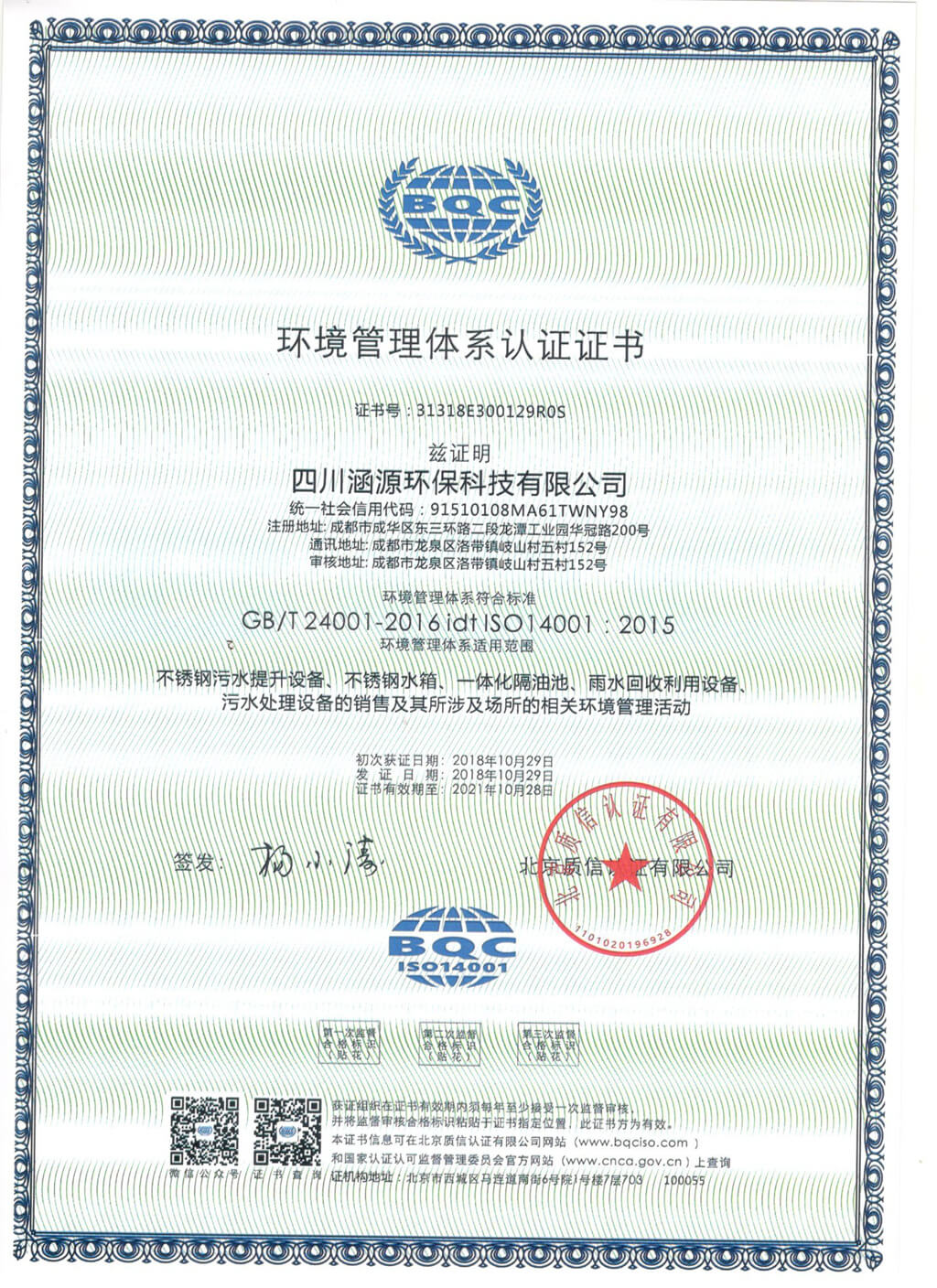 環境管理體系認證證書